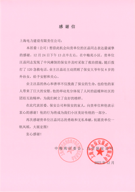 近日,公司本部收到一封來自中梅苑居委會和萬全保安公司的聯名感謝信,對公司市場開發部職工汪晶同志的熱心善舉和無私奉獻表示感謝。 2023年12月24日,汪晶同志在中梅苑小區發現了中風癱倒的保安,他毫不猶豫地采取了正確的急救措施并且撥打120急救電話,并主動照顧了保安大爺年僅八歲的外甥女。如今,那名保安已經平安無事。因為汪晶同志的愛心和細心,不僅挽救了保安的生命,更是給他的家人帶來了巨大的安慰。 這一封簡簡單單的感謝信,不僅承載著老人家屬真誠的感謝,更是在這個寒冷又平凡的冬日里,平添了幾分不同尋常的溫情。汪晶同志的熱心善舉,用實際行動踐行了企業精神,展現了一名電建人的素養。溫暖的大家庭里,才會培養出有一個溫度的人,才會締造出一顆溫暖的心,公司將繼續積極踐行社會主義核心價值觀,大力弘揚見義勇為精神,弘揚社會正能量。 |